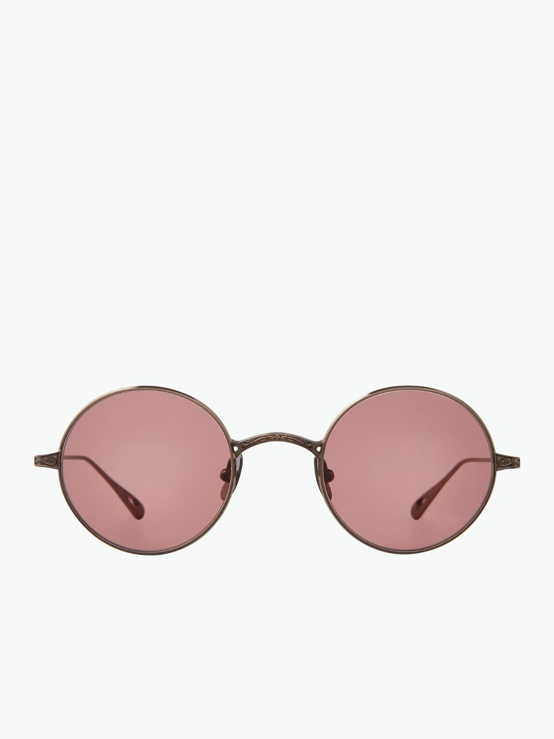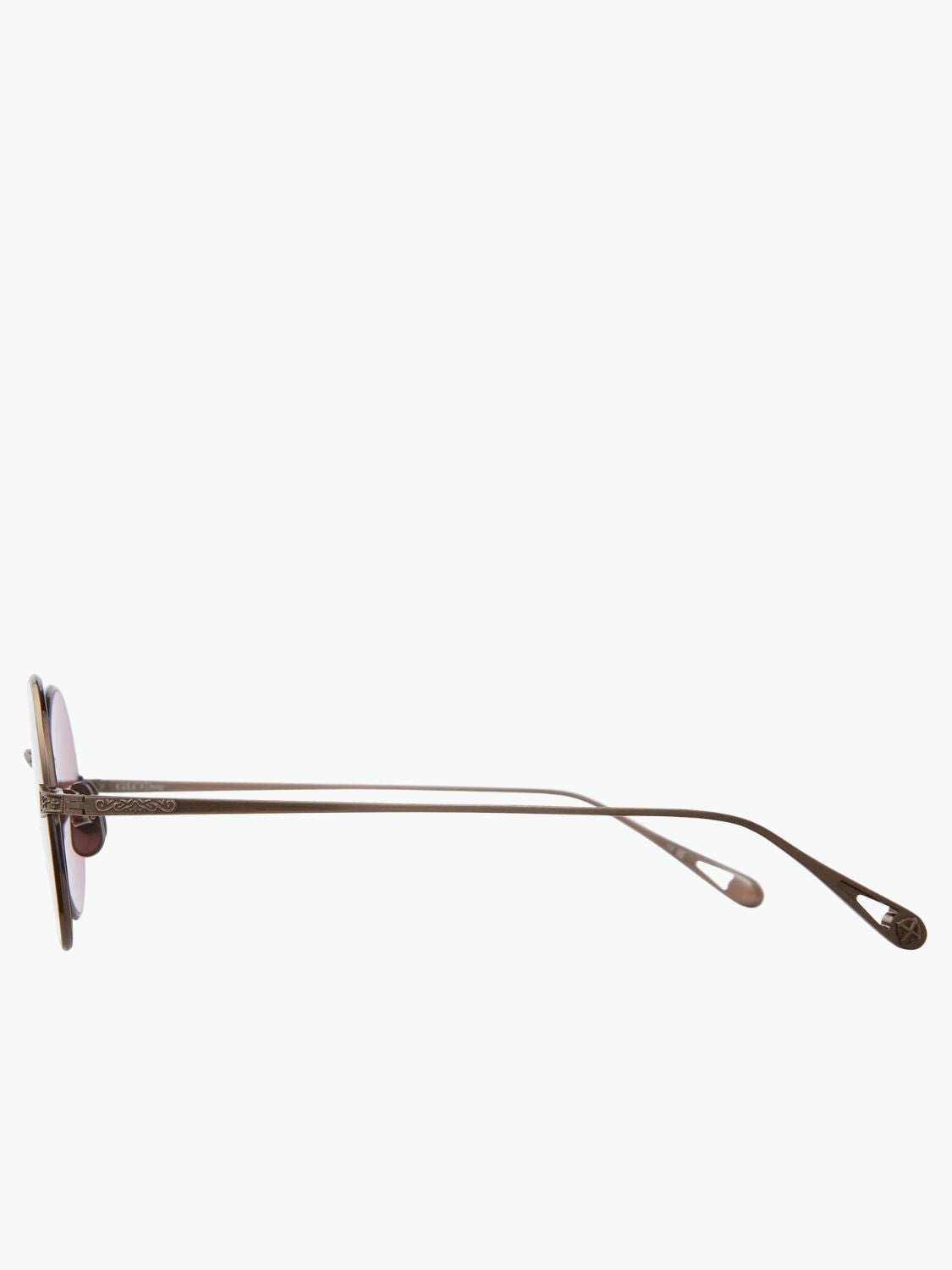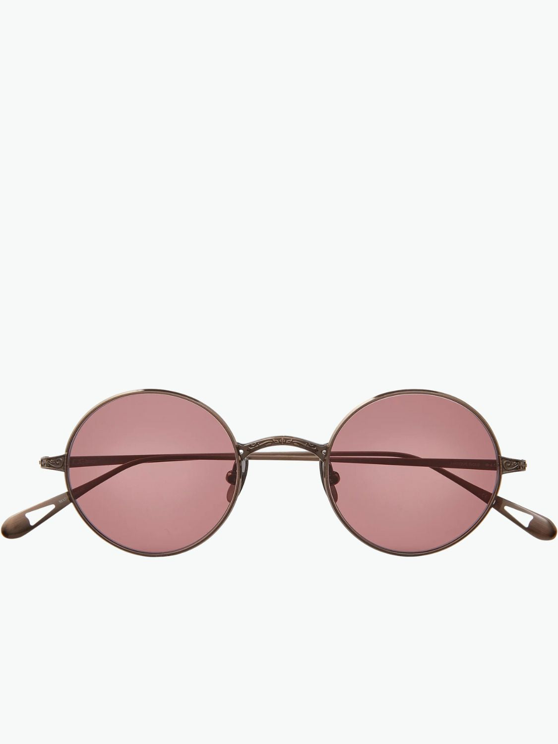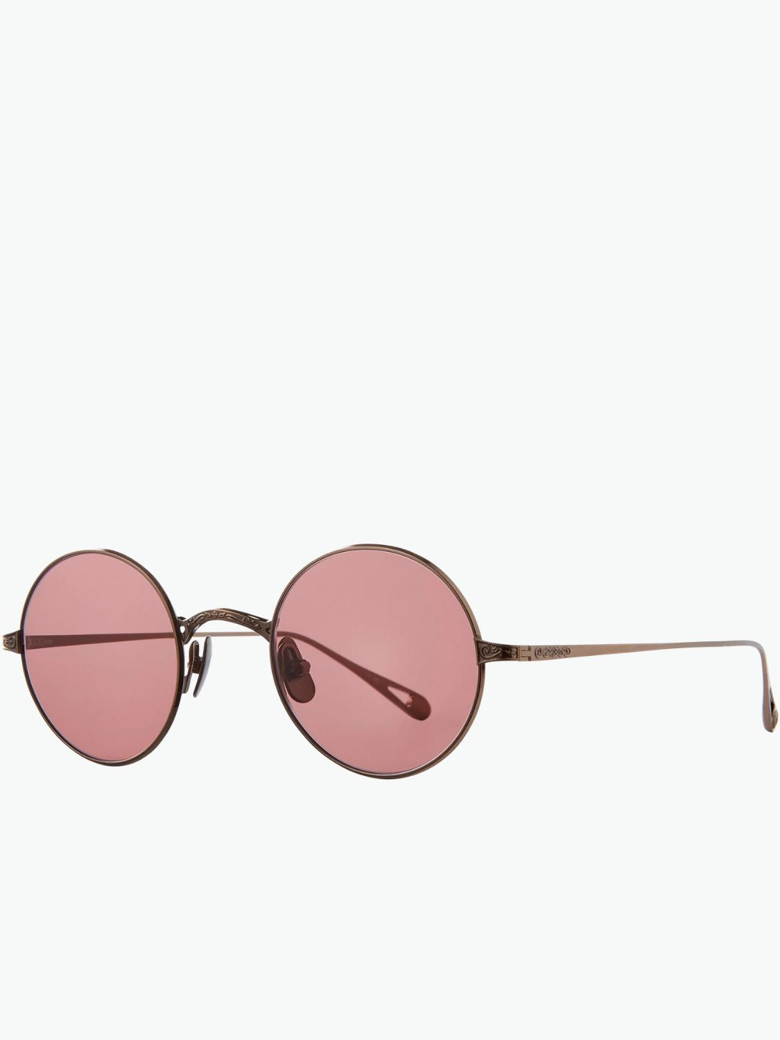 The antique gold titanium frame features intricate GLCO-exclusive filigree detailing, a sculpted bridge, and temple ball engravings with Ozzy’s iconic “O.” The semi-flat garnet lenses offer 100% UV protection and an unmistakable vintage allure, housed in a bespoke metal case.