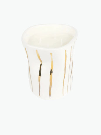 The ceramic vessel, adorned with hand-painted gold stripes, captures the soft interplay of light and texture, turning every flicker into a moment of quiet indulgence. Once the candle has fully burned, the piece can be reused as a decorative accent, reflecting the brand’s thoughtful approach to sustainable beauty.