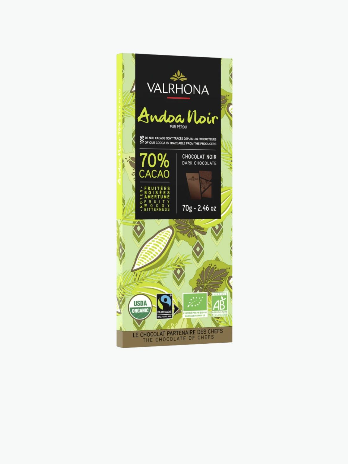 Enjoy the new taste of Valrhona Andoa Organic Bittersweet Dark Chocolate. The Andoa, 70% Cacao, is a fresh and bittersweet Fairtrade and Organic Dark Chocolate. This chocolate tempts the palate with powerful, bittersweet notes, developing into shades of freshness that symphonize the tasting experience.