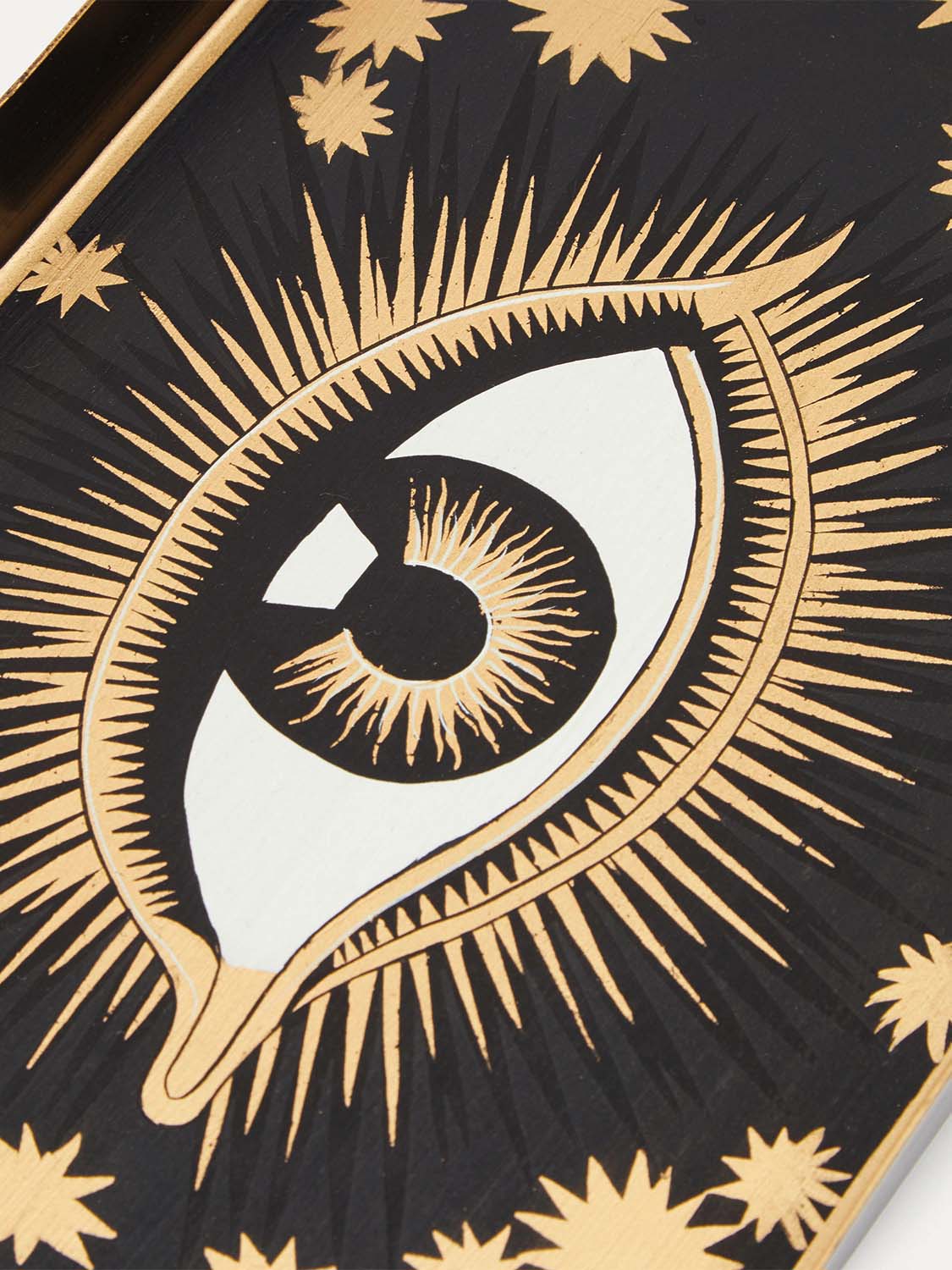 Les Ottomans showcases whimsical designs such as this white rectangular metal tray, inspired by the extensive travels of founder Bertando Di Renzo. Crafted from iron, it features a gold-edged rim and a hand-painted eye motif at the center, surrounded by a celestial starburst. Use it as an artistic display for ornaments and scented candles to add a touch of unique charm to your space.