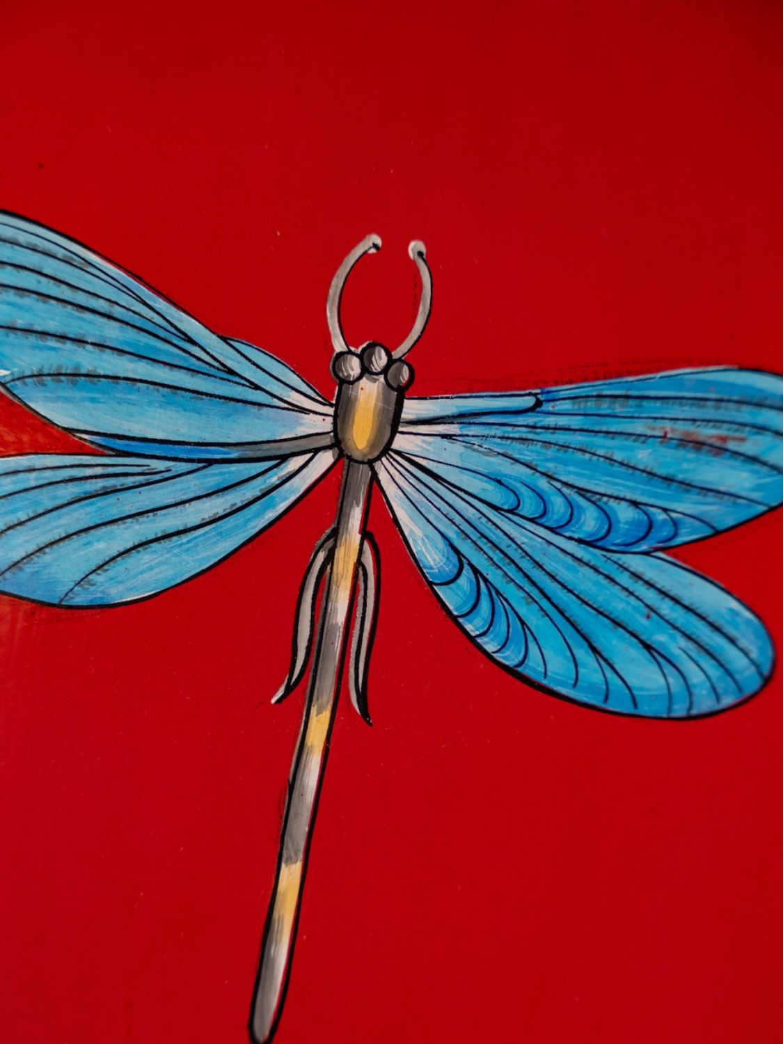 - Features a detailed dragonfly motif on a vivid red base.