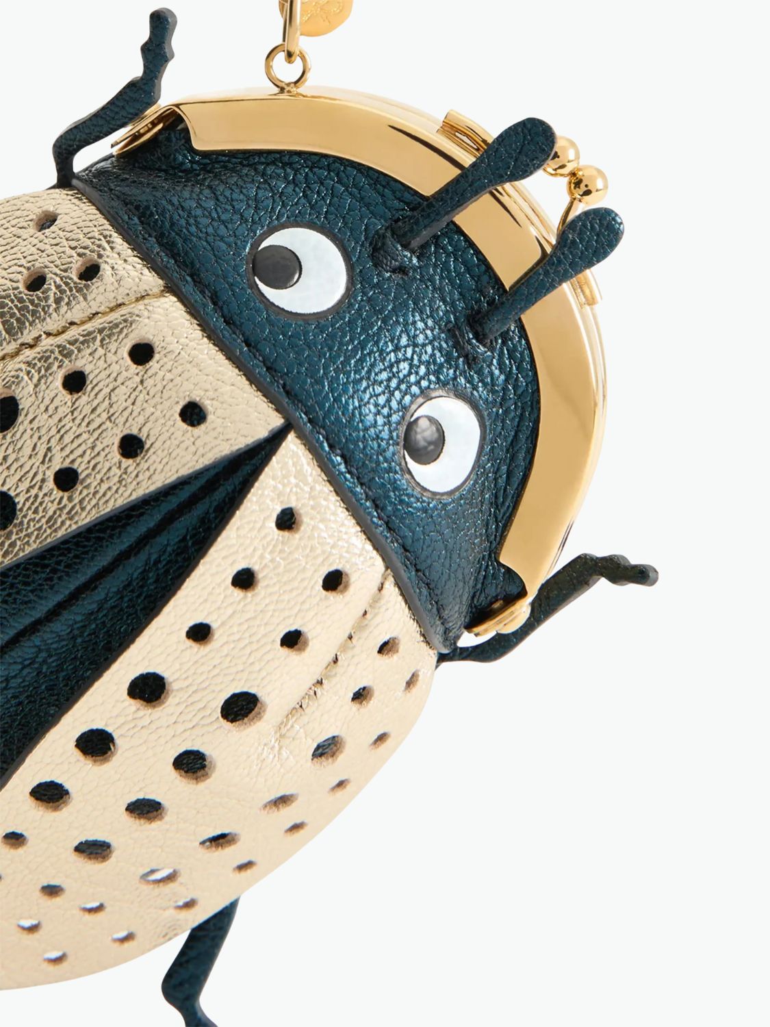 Playful yet exquisitely crafted, the Bug Coin Purse Charm is a testament to Anya Hindmarch’s ability to blend humor with high craftsmanship. Expertly made from capra leather in black and gold, this charming beetle-inspired design features intricate perforated detailing, a kiss-lock mouth, and delicate leather legs that bring it to life.