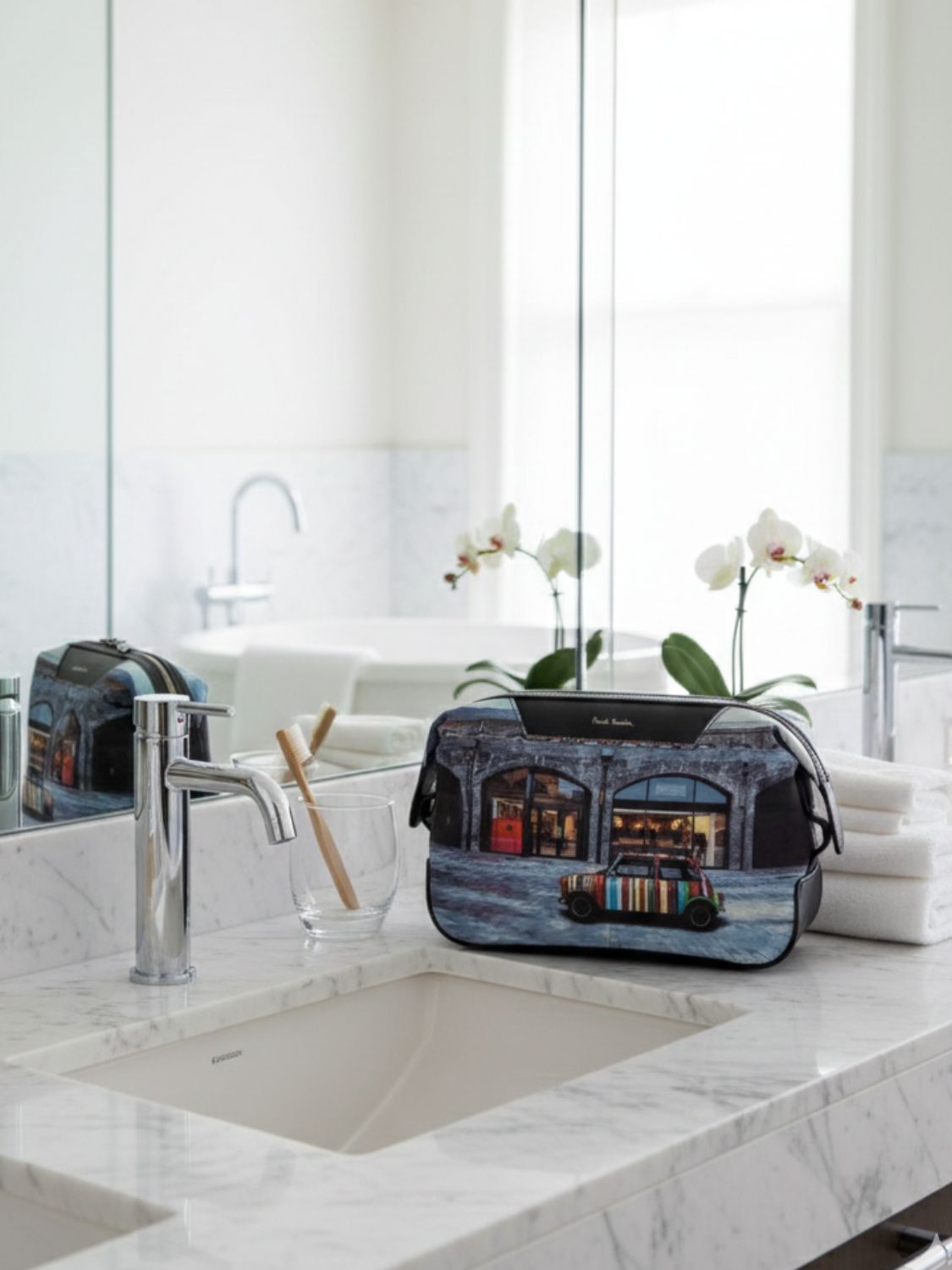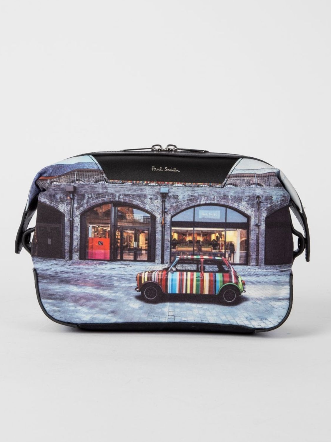 Paul Smith wash bag captures the designer’s signature mix of wit and craftsmanship. It features a vivid print of the iconic Paul Smith Mini outside the brand’s Kings Cross store. Inside, two compartments keep grooming essentials neatly organized, while a leather logo patch adds a refined touch. Complete with a branded dustbag, it’s a stylish, functional companion for travel or daily use, classic Paul Smith with a contemporary twist.